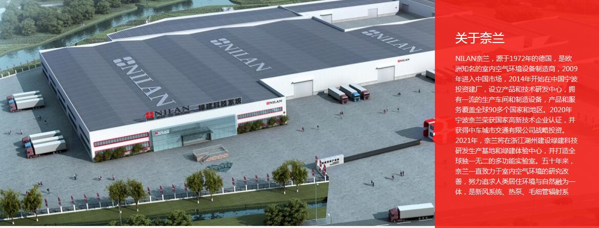 寧波奈蘭環(huán)境系統(tǒng)有限公司(NILAN)源于1972年的德國,是歐洲知名的室內(nèi)空氣環(huán)境設備制造商,2009年進入中國市場,2014年開始在中國寧波投資建廠,設立產(chǎn)品和技術研發(fā)中心,擁有一流的生產(chǎn)車間和制造設備,產(chǎn)品和服務覆蓋全球90多個國家和地區(qū)。2020年寧波奈蘭榮獲國家高新技術企業(yè)認證,并獲得中車城市交通有限公司戰(zhàn)略投資。2021年,奈蘭將在浙江湖州建設綠建科技研發(fā)生產(chǎn)基地和綠建體驗中心,并打造全球獨一無二的多功能實驗室。五十年來,奈蘭一直致力于室內(nèi)空氣環(huán)境的研究改善,努力追求人類居住環(huán)境與自然融為一體,是新風系統(tǒng)、熱泵、毛細管輻射系統(tǒng)、被動房配套技術等產(chǎn)品服務的優(yōu)質(zhì)品牌廠家,同時在健康綠色住宅領域有著深厚沉淀,奈蘭健康住宅七度空間一體化解決方案,即“THONFIE”毛細七恒系統(tǒng),在國內(nèi)外民、商、政等各領域有著豐富的項目案例應用實踐經(jīng)驗,深受行業(yè)認可和用戶喜愛——奈蘭,讓家融于自然!